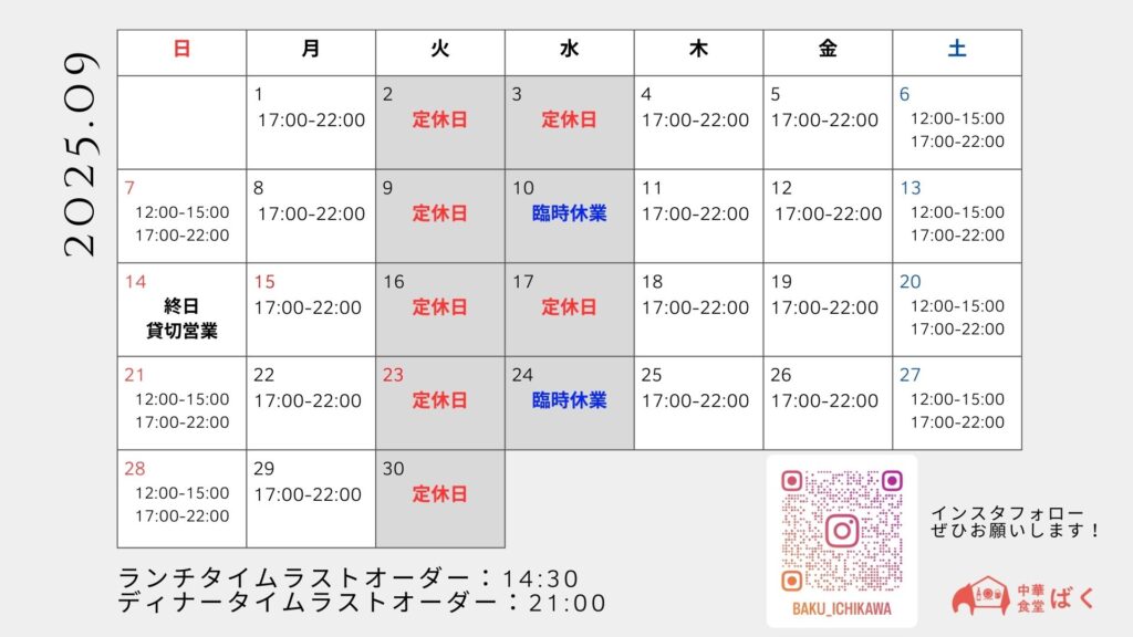 9月の定休日は…