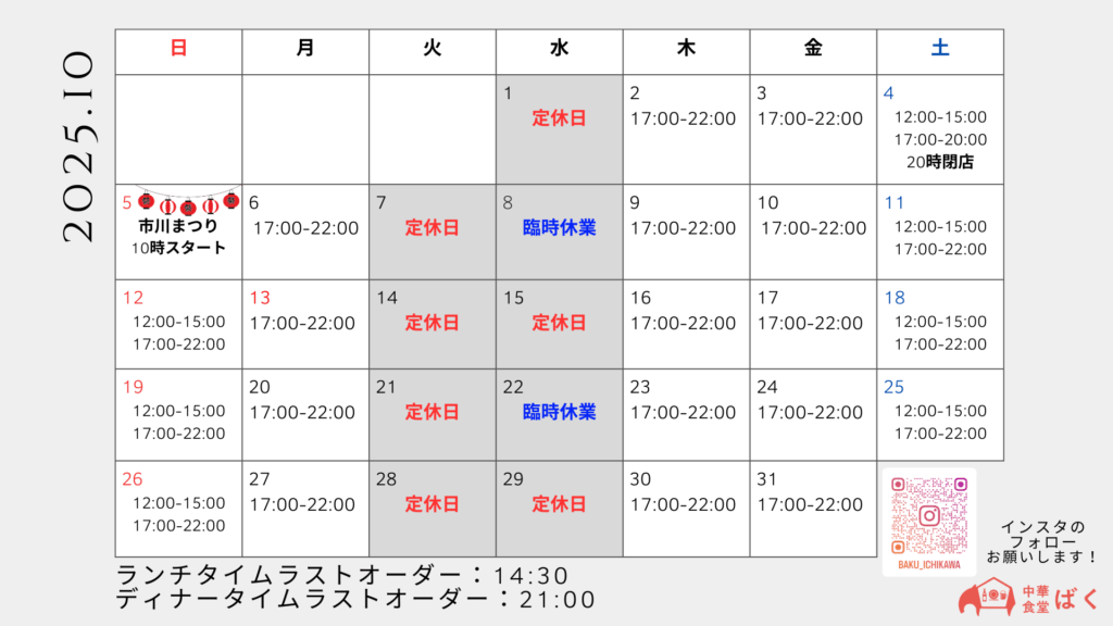 ※10月4日(土)は、翌日に開催されます市川まつりの準備のため18時閉店となります。